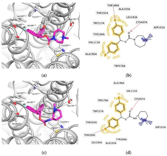 Overall, the selected carbamates 1–12 engage in similar pharmacophoric interactions with the orthosteric binding site of the M1 muscarinic receptor. Compound 2 adopts an extended pose, engaging with many of the residues featured in the binding mode of tiotropium (Figure 4a,b) []. As required by our post-docking filter, the 1,4-diazepane’s N-methyl ammonium group forms a salt bridge with Asp1053.32; however, unlike many known agonists and antagonists, 2 does not interact with Asn3826.52 [], instead it is predicted to form a hydrogen bond with Cys4077.42. In fact, this interaction with Cys4077.42 together with a fluorine–hydrogen bond with Thr1895.39 is shared among the whole compound selection except for 5 (Supplementary Materials, Figure S1). The carbonyl oxygen of spirocyclic 5, by contrast, acts as a hydrogen bond acceptor for Tyr1063.33. Compounds 3, 4, and 8 not only engage in hydrogen bonding with Cys4077.42, but form yet another hydrogen bond with Asn3826.52 (Supplementary Materials, Figure S1d,f,l). While the fluorinated benzhydrol part of the molecules 2 and (R)-7 adopt an almost identical pose, occupying the binding site’s two lipophilic pockets, the ammonium groups differ slightly in their spatial position attributable to the different ring geometries (Figure 4c). Compared to 2, the protonated amine of (R)-7’s piperidine ring is tilted, enabling another favorable cation–π interaction with Tyr4047.39, a key interaction in many known muscarinic ligands (Figure 4d) []. The enantiomeric pairs of the secondary carbamates 7 and 9–12 are predicted to adopt largely overlapping poses (Supplementary Materials, Figure S2). Since it was difficult to identify any stereospecificity of the pharmacophore from those, we decided to move along with the racemic versions of the aforementioned compounds at this stage, having the additional benefit of speeding up the biological testing.