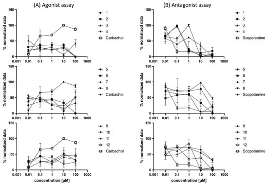For the Fluo-4 Direct™ Assay Kit (Invitrogen, Waltham, MA, USA), 100 µL of a 5 105 cells/mL suspension of CHO-hM1 cells were seeded in black clear bottom 96-well plates (Corning®, Corning, NY, USA). After settling of the cells for 24 h, the kit was used according to the manufacturer’s protocol. In detail, the medium was removed, and 50 µL of Hanks’ Balanced Salt Solution (HBSS) was added, followed by 50 µL of the Fluo-4 buffer solution (including probenecid). The 96-well plates were incubated for 60 min at 37 °C in the dark. For the agonist assay, 100 µL of a double-concentrated dilution series of carbachol (positive control) and compounds 1–12 were added with the end concentration of 100, 10, 1, 0.1, 0.01 and 0 µM. The relative fluorescence was measured with an excitation wavelength of 494 nm and an emission wavelength of 516 nm. For the antagonist assay, 50 µL of a 4-fold concentrated dilution series of scopolamine hydrochloride (positive control) and compounds 1–12 were added. Subsequently, an 80 µM stock solution of carbachol was added to all wells, and the relative fluorescence was measured with an excitation wavelength of 494 nm and an emission wavelength of 516 nm. Stock solutions of the compounds were in DMSO with a final concentration not exceeding 1% of DMSO.