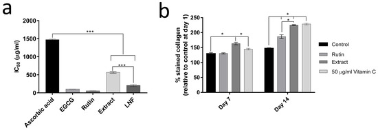 Anti-aging activities’ evaluation of fenugreek extract: (a) In vitro collagenase inhibition of fenugreek extract (denoted as Extract) and liponiosome encapsulating fenugreek extract (denoted as LNF). (b) Effect of fenugreek extract on collagen production. Human dermal fibroblast cells were treated with 125 µg/mL of fenugreek extract and rutin, and 50 µg/mL of vitamin C as a positive control and 0.005% DMSO as a control (vehicle), for 7 and 14 days. Data are reported as means ± SD (n = 3). *, p < 0.05; ***, p < 0.001.