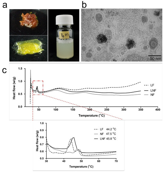 Physical appearances of fenugreek extract and liponiosome encapsulating fenugreek extract (LNF): (a) (Upper left) fenugreek extract form, (lower left) LNF paste form, and (right) 1% in water solution. (b) Physicochemical characterization of formulated nanoparticles showing a transmission electron microscope (TEM) image of LNF. (c) Physicochemical characterization of formulated nanoparticles showing a differential scanning calorimeter (DSC) graph of LNF compared to LF and NF.