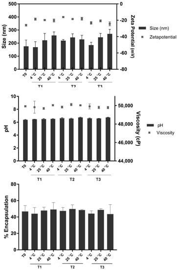 LNF was kept at 4 °C, 25 °C, and 40 °C for 3 months to study its stability in terms of particle size, PdI, and ζ potential using the DLS technique. The pH and viscosity of the obtained particles were also investigated. We observed a slight increase in the particle sizes stored at 40 °C compared to 4 °C, but these changes were not statistically different. Additionally, there was no significant change in the other characteristics of formulated LNF, including pH, viscosity, and % encapsulation. These results all suggested that the obtained particles were physiochemically stable (Figure 4).