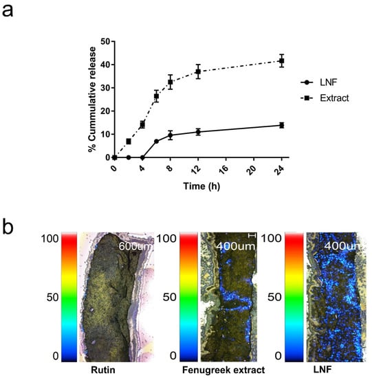 The releasing profile and skin penetration of formulated LNF: (a) In vitro releasing profiles of LNF within 24 h using Franz diffusion cells. (b) Porcine skin permeabilization. The IMS image showed the cumulative amount of rutin (blue) permeated through porcine skin, which was treated with rutin standard, fenugreek extract, and LNF for 24 h. Rutin was detected at 609 m/z.