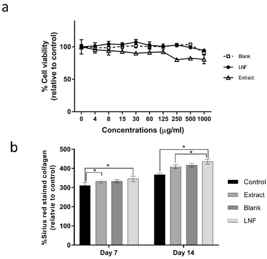 To investigate the cytotoxicity of formulated LNF, cells were treated with blank, LNF, and fenugreek extracts at 0–1000 µg/mL (twofold dilution) for 24 h. Cell viabilities were measured using an MTT assay. As shown in Figure 6a, the cell viability decreased in extract-treated cells, whereas no effect was observed in blank and LNF-treated cells. The data indicated that LNF showed a lower toxicity than extract. We further investigated the ability of LNF on the induction of collagen production in human dermal fibroblast cells. Cells were treated with 7 µg/mL of extract and 100 µg/mL of LNF (7 µg/mL of extract equivalence), together with blank particles as a control, for 7 and 14 days. As shown in Figure 6b, for treatment with LNF, the amount of stained collagen was increased by 30% and 50% at 7 and 14 days, respectively, compared to extract treatment. Additionally, in Figure 2a, the formulated LNF enhanced anti-collagenase activity, as IC50 was significantly reduced to 0.21 ± 0.03 mg/mL compared to fenugreek extract (0.57 ± 0.02 mg/mL). These results demonstrated that the formulation of LNF could potentiate an induction of collagen production in human dermal fibroblast cells and enhance the anti-collagenase activity of fenugreek extract. It is possible that nano-formulation of fenugreek extract significantly improves its potency as an active ingredient in anti-aging products.