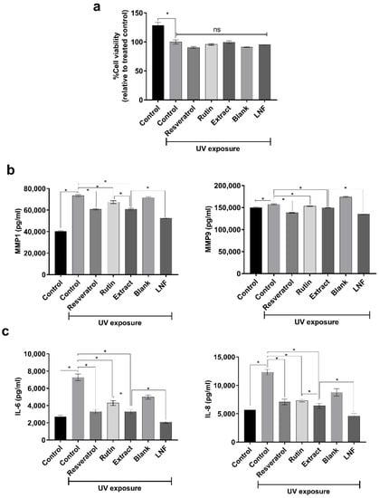 Inhibition of UV-induced MMPs and interleukin secretion on co-cultured skin cells by fenugreek extract and LNF: (a) Effect of UV-induced cytotoxicity after the pretreatments of resveratrol, rutin, fenugreek extract, blank nanoparticles (liponiosome without fenugreek extract), LNF nanoparticles, and 0.005% DMSO as a control (vehicle). HaCAT and human dermal fibroblast cells were co-cultured and pretreated with 7 µg/mL of extract and 100 µg/mL of LNF (7 µg/mL of extract equivalence), together with 100 µg/mL of blank, 10 µg/mL of resveratrol, 7 µg/mL of rutin as a positive, and 0.005% of DMSO as a control (vehicle), for 24 h before UV exposure. Data are means ± SD (n = 3). *, p < 0.05. (b) The levels of UV-induced MMP1 and MMP9 secretions after fenugreek extract and LNF treatments. Data are reported as means ± SD (n = 3). *, p < 0.05. (c) The levels of UV-induced IL-6 and IL-8 secretions after fenugreek extract and LNF treatments. Data are reported as means ± SD (n = 3). *, p < 0.05.