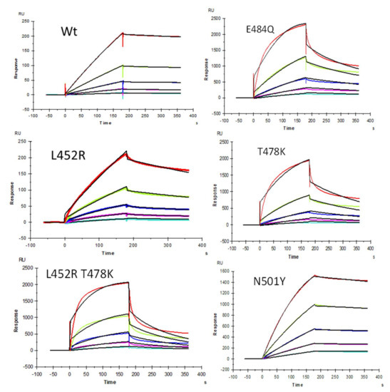 SPR sensorgrams of S-protein RBD wild type (WT) and mutants’ interactions with heparin. Concentration of S-protein mutants (from top to bottom): 1000, 500, 250, 125, and 63 nM, respectively. The black curves are the fitting curves using models from T200 Evaluate software.