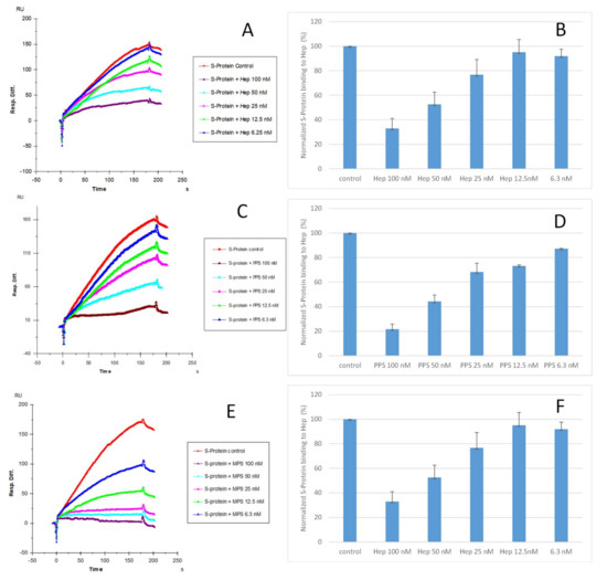 Solution/surface competition experiments were performed using SPR to examine the inhibition of sulfated glycans to the interaction between heparin (on surface) with S-protein. PPS and MPS potently inhibited the S-protein–heparin interaction, while sulfated lactobionic acid, GL-288-Y-1, GL-522-Y-1, and GL-522Y-1 calcium exhibited a modest inhibition activity (Figure 3). Relatively lower inhibition activity of different versions of defibrotide was observed. Based on these data, PPS and MPS were selected for further investigation. Importantly, the FDA has approved PPS as an oral anti-thrombotic agent for the management of patients with interstitial cystitis, and it is also used for clinical disorders such as antagonism of enzymatic activities and inhibition of HIV infectivity [29,36,37]. MPS has been used for the topical treatment of superficial phlebitis, hematomas, and sports-related injuries [30].