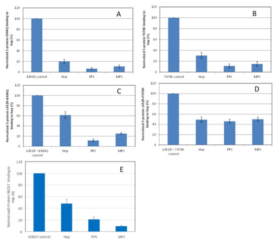 Bar graphs (based on triplicate experiments with standard deviation) of normalized S-protein RBD mutants: (A) E484Q; (B) T478K; (C) L452R+E484Q; (D) L452R+T478K; (E) N501Y binding to surface heparin by inhibiting with PPS and MPS or heparin at a concentration of 1000 nM in solution.