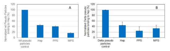 Bar graphs (based on triplicate experiments with standard deviation) of normalized pseudotyped viral particles binding to surface heparin under inhibition with RS or heparin. (A) Wild-type pseudo virus particles inhibited by heparin, PPS, and MPS; (B) Delta variant pseudotyped viral particles inhibited by heparin, PPS, and MPS.