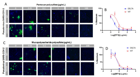 In vitro SARS-CoV-2 pseudotyped viral particle (WT and Delta variant) neutralization assay. (A,C) Representative fluorescence microscopy of different concentrations of PPS and MPS inhibition assay. (B,D) IC50 curves of PPS and MPS inhibiting SARS-CoV-2 pseudotyped virus (WT and Delta variant). Control experiments were performed using HA and dextran (MW: 12,000 Da), a charged, polyanionic glycosaminoglycan, and an uncharged polysaccharide, respectively. No antiviral activity was observed in either of these controls.