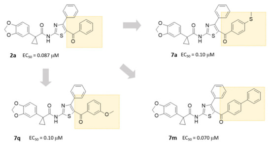 In this second round, we adopted a strategy leading to several promising compounds such as 7a, 7m, and 7q, with comparable or higher potency than 2a (EC50 = 0.10 µM, EC50 = 0.070 µM (Figure 1) [28].
