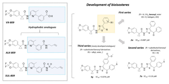 During the last years, we described the rational design process and the chemical synthesis of different series of VX-809 congeners [27,28], thought to be hybrid derivatives based on the benzodioxole-containing carboxamide motif of the reference corrector and the thiazole ring previously experienced by the in-house CFTR modulators [26].