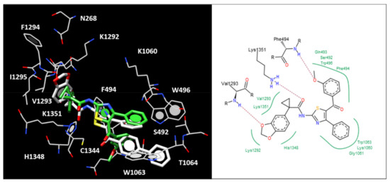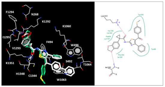 As shown in Figure S3, 2a maintained the key H-bonds with K1351 and I1295 by means of the carboxamide and benzodioxole motif as described for the previous reference correctors while the carbonyl moiety obliged the compounds to move only the unsubstituted phenyl ring linked at the thiazole position 4 towards S492, F494 and W496, W1063, detecting hydrophobic and π–π interactions. These data suggested a pivotal role determined by lipophilic substituents onto the main thiazole ring, in order to achieve lipophilic contacts with the channel, especially involving the aforementioned aromatic residues F494, W496, and W1063. On the other hand, H-bonds with K1351 and I1295 seem to guarantee the F508del-CFTR corrector activity.