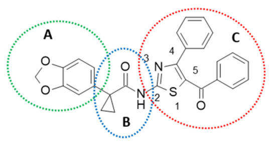 The SAR study was based on the study of the role of the benzo[d][1,3]dioxole portion (A), the substitution of cyclopropane carboxamide moiety (B), and the modification of the pattern substitution on the thiazole ring (C).
