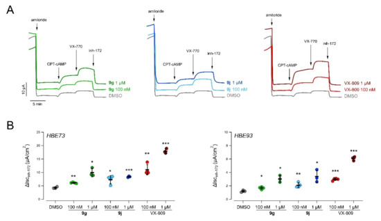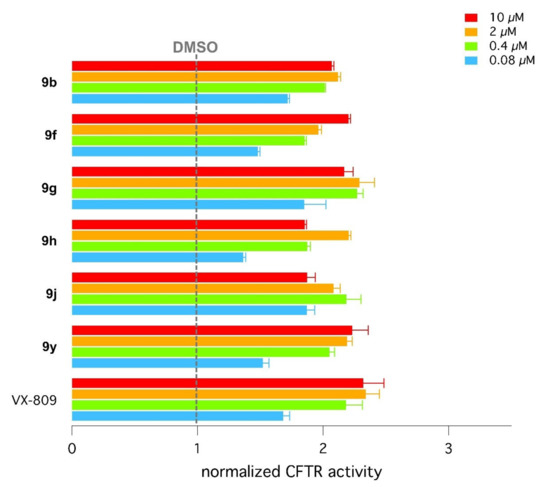 The measurements of the rate of HS-YFP quenching caused by iodide influx allowed us to determine the activity of F508del-CFTR, after incubation with the compounds, as cited [27]. Activity was then compared to that of cells treated with the corrector VX-809 (1 µM) or with vehicle alone (DMSO).