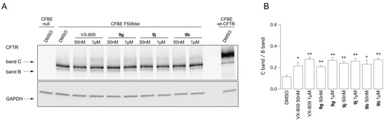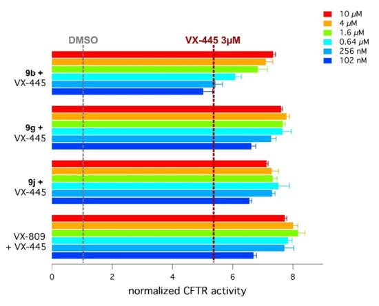 Most of them proved to be promising F508del-CFTR correctors, being endowed by rescue activity in primary bronchial epithelia. As a result, these data confirmed the effectiveness of the di-substituted thiazole core as bioisostere of the methyl pyridine ring exhibited by VX-809.