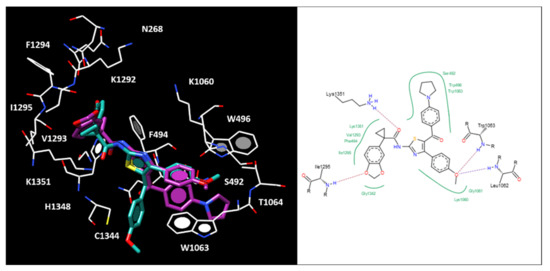 Conversely, the most potent compound 2a lacking of flexible chains at the position 5 of the main ring, experienced a higher potency profile being able to detect more contacts and H-bonds with the protein, similarly to ALK-809 and SUL-809 [29].