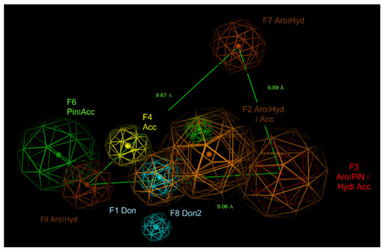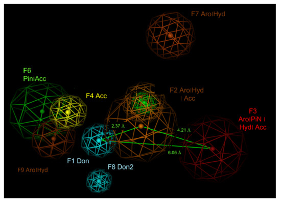 Figure 13. The main pharmacophore requirements experienced by hybrids are reported along with their related distances, focusing on F3, F7, andF9 groups. H-bonding groups are named as F Acc and F Don while aromatic features are reported as F Aro.