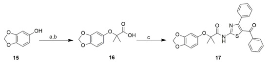 In Scheme 3, ethyl 2-(benzo[d][1,3]dioxol-5-yloxy)-2-methylpropanoate was prepared by reaction of ethyl-2-bromoisobutyrate and benzo[d][1,3]dioxol-5-ol 15 in DMF at room temperature in the presence of K2CO3. Hydrolysis of substituted ester under aqueous basic conditions yielded acid derivative 16. Amide coupling of 16 with 2-amino-4-phenylthiazol-5-yl)(phenyl)methanone afforded final compound 17 with a yield of 22%.