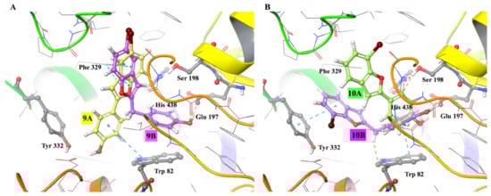 Specifically, compounds 9A and 10A—which showed negligible inhibitory activity—were modified respectively to compounds 9B and 10B. Experimental results suggested an improvement in enzyme inhibition for compounds 9B and 10B. Therefore, molecular docking was performed for compounds (9A, 9B, 10A, and 10B) to understand better the outcome of adding a methylene spacer on the compound’s activity against hBChE protein. Docking results (Table 2) suggested superior docking energy values for the compounds with a methylene spacer, and among them, compound 9B displayed the best docking energy value against the target protein hBChE.