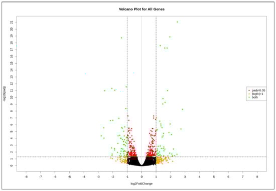 - Love, M.-I.; Huber, W.; Anders, S. Moderated estimation of fold change and dispersion for RNA-seq data with DESeq2. Genome Biol. 2014, 15, 550. [Google Scholar] [CrossRef] [PubMed] [Green Version]