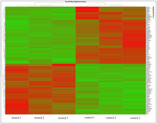 The gene expression profiling of HL60 leukemia cells before and after TQ-treatment was performed for the whole transcriptome using NGS analysis. There were more than 1900 genes that showed different expression in TQ-treated HL60 leukemia cells. Volcano plots of the gene expression data in HL60 associated with TQ treatment (Figure 1) show significant DEGs at p-adj < 0.05 and fold change with absolute value >1. There were 54 genes that showed significant upregulation, and 60 genes were significantly downregulated after treatment of HL60 cells with 2 μM TQ. In general, tumor suppressor genes, including pro-apoptotic genes, were upregulated, while many oncogenes were downregulated. The gene expression profiling analysis also showed 100 obviously differentially expressed genes of down- versus upregulated genes in three TQ-treated HL60 cell samples compared to three untreated samples (Figure 2).