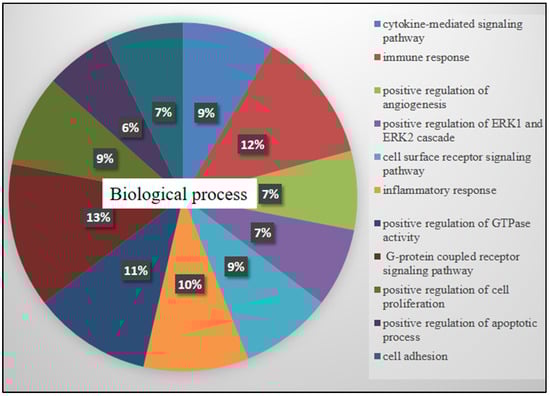 Free online DAVID Functional Annotation Bioinformatics Microarray Analysis was conducted to analyze possible mechanisms of the top modulated genes in HL60 cells related to TQ treatment. The biological process analysis (Figure 3) showed that the majority of genes were distributed in G protein-coupled receptor pathways (11 genes were involved), immune response (10 genes), regulation of GTPase activity (9 genes), inflammatory response (8 genes), cytokine-mediated and cell surface receptor pathways (7 genes each), regulation of angiogenesis and cell adhesion (6 genes each), and regulation of apoptosis (5 genes). In cellular components (Figure 4). The plasma membrane was the active site for the majority of affected genes (86 genes).