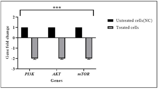The results of RT-qPCR revealed significant downregulation of AKT (p < 0.001), PI3K (p < 0.001), and mTOR (p < 0.001) expression in TQ-treated HL60 cells as shown in Table 5 and Figure 6. These results were consistent with the NGS results.