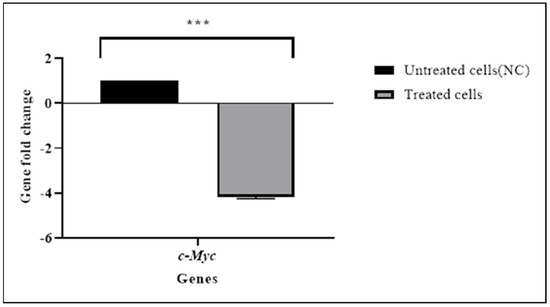 This study aimed primarily to study the effect of TQ on c-Myc. Therefore, the effect of TQ on the c-Myc mRNA level was evaluated in HL60 cells by RT-qPCR (Figure 7). The results showed that TQ significantly decreased the expression of c-Myc (p < 0.001) (Table 6). The NGS and RT-qPCR both indicated downregulation of c-Myc expression in TQ-treated cells.