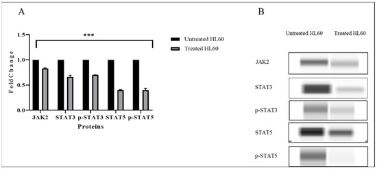 Jess assay Western blotting analysis was performed to examine the effect of TQ on JAK/STAT signaling in HL60 leukemia cells. The cells were incubated with 2 µM TQ for 48 h; then, the protein was extracted from treated and untreated HL60 leukemia cells for the protein analysis. The results showed that TQ significantly suppressed the expression of JAK2, STAT3, and STAT5 proteins (p < 0.001) (Figure 8). The results also revealed that TQ inhibited the activation of JAK/STAT signaling through dephosphorylation of STAT3 and STAT5 proteins.