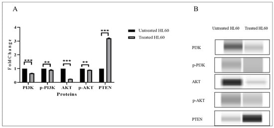 Effects of TQ on the expression of PI3K/AKT proteins in HL60 cells. (A) PI3K, p-PI3K, AKT, p-AKT, and PTEN protein expression in TQ-treated cells compared with untreated cells or negative control. Data are presented as the mean ± SEM (*** p < 0.001; ** p < 0.01). (B) Image of PI3K, p-PI3K, AKT, p-AKT, and PTEN protein expression from capillary Western blotting in treated and untreated HL60 cells.