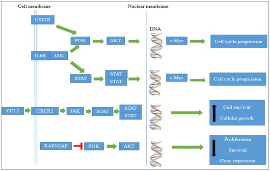 The NGS results showed downregulation of JAK/STAT and PI3K/AKT/mTOR genes in TQ-treated cells. The results also revealed significant downregulation in genes that induced the activation of JAK/STAT and PI3K/AKT/mTOR pathways (Figure 11) such as chemokine (C–C motif) ligand 2 (CCL2) [36], colony-stimulating factor 1 receptor (CSF1R) [37], CXC chemokine receptor 2 (CXCR2) [38], interleukin 6 receptor (IL6R) [39], G protein-coupled receptors (GPCRs) [40], and chitinase 3 like 1 protein (Chi3L1) [41]. These findings suggest that TQ induces apoptosis and inhibits cancer cell proliferation by inhibiting the JAK/STAT and PI3K/AKT/mTOR signaling pathways. This suggestion is supported by previous studies where TQ induced apoptosis by inhibiting the activation of the PI3K/AKT pathway in the oral squamous carcinoma KB cell line [42] and inhibited cell proliferation through suppression of the JAK/STAT pathway in human multiple myeloma cells [43]. In contrast, our results showed the upregulation of genes that functioned to inhibit the JAK/STAT and PI3K/AKT/mTOR pathways’ activation including PRDI-BF1 and RIZ homology domain-containing 8 (PRDM8) [44] and RAP1 GTPase activating protein (RAP1GAP) [45]. In the present study, there was a significant upregulation of PRDM8 (p < 0.044) and RAP1GAP (p < 0.029) in TQ-treated HL60 leukemia cells, suggesting that TQ inhibited HL60 cell growth and suppressed c-Myc expression by inhibition of JAK/STAT and PI3K/AKT/mTOR signaling through upregulation of PRDM8 and RAP1GAP.