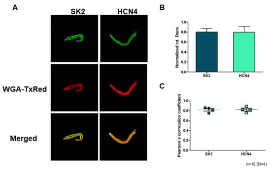 SK2 expression was directly detected on isolated sinus node cells. Confocal microscopy on immunostained sinus node cells revealed abundant expression of SK2 channels on the surface membrane (Figure 1A). The SK2 fluorescence intensity does not show difference from the sinus node-specific HCN4 (n = 16 cells/4 animals; p = 0.97; Figure 1B). Colocalization of the SK2 immunofluorescence with WGA Texas-Red fluorescence was then analyzed by Pearson’s Correlation Coefficient (PCC) and we found that average PCC values of SK2 (0.82; (0.75–0.86)) were similar with HCN4 (0.82; (0.76–0.89); n = 16 cells/4 animals; p = 0.89; Figure 1C). These data suggest that SK2 is represented in the membrane of sinus node cells as HCN4.