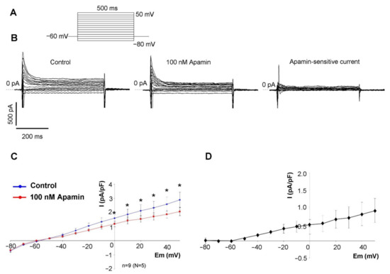 Characterization of the apamin-sensitive current. (A) illustrates the applied voltage protocol. (B) shows total membrane current under control condition (left curves), after 100 nM apamin application (middle curves), and the apamin sensitive current (right curves). (C) shows the current-voltage diagram of the control and apamin-treated currents and (D) illustrates the current-voltage relationship of the apamin-sensitive current. Statistical analysis was performed by paired t-test (p < 0.05).
