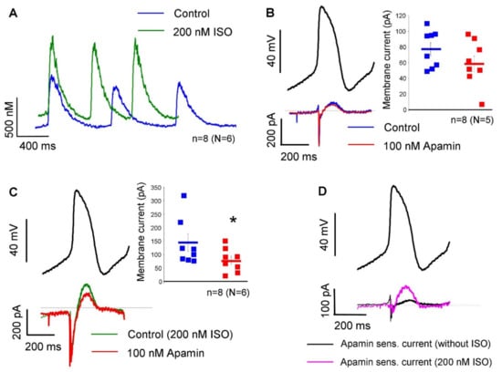 Measurement of apamin-sensitive current under a representative SAN action potential waveform in the absence and in the presence of 200 nM isoproterenol (ISO). (A) demonstrates the effect of 200 nM isoproterenol on Ca2+ transients. When isoproterenol was omitted, 100 nM apamin (red curve) did not alter the peak of the total current (blue curve, panel (B)). In the presence of 200 nM isoproterenol, 100 nM apamin (red curve) decreased the peak current (green curve, panel (C)). Representative original traces were determined after subtraction of currents. When 200 nM isoproterenol was employed, the apamin-sensitive current (purple curve) was larger than under normal conditions (black curve, panel (D)). Paired and unpaired t-tests (p < 0.05).