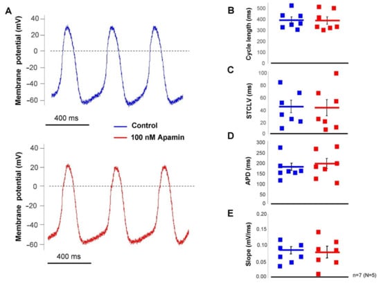 Action potential recordings from isolated SAN cells by perforated patch-clamp technique under normal condition. After control recordings (blue curve), 100 nM apamin was employed (red curve, (A). Bar graphs reported identical cycle lengths (B), short-term cycle length variability (C), APD (D), and slope of diastolic depolarization (E). Statistical analysis was performed by paired t-test.