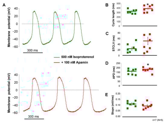 Action potential recordings from isolated SAN cells by perforated patch-clamp technique in the presence of 200 nM isoproterenol. The control recordings were measured in the presence of isoproterenol (green curve), then 100 nM apamin was employed (red curve, (A)). Application of apamin increased the cycle length (B) without alteration of the short-term cycle length variability (C), and increased the APD (D) without changing the diastolic depolarization (E). Statistical analysis was performed by paired t-test (p < 0.05).