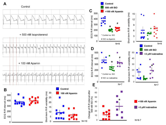 Results of Langendorff-perfused experiments on isolated hearts. (A) demonstrates original ECG traces in control condition (upper panel), in the presence of 200 nM isoproterenol (middle panel), and after apamin application (lower panel). Red vertical dashed lines indicate the change of the cycle lengths. (B) represents the basal condition (i.e., without application of isoproterenol). The ECG R-R interval (left graph) and the R-R variability (right graph) were unaltered after apamin administration. (C) represents apamin application in the presence of 500 nM isoproterenol. 100 nM apamin increased the ECG R-R interval (left graph), however, it did not change the R-R variability (right graph). (D) illustrates the effect of 3 µM ivabradine. Ivabradine markedly increases the R-R interval (left graph) and the R-R interval variability (right graph). (E) shows the comparison of the effects of apamin and ivabradine on the ECG R-R interval after 200 nM isoproterenol. Statistical analysis was performed by paired t-test and repeated measures ANOVA (p < 0.05).