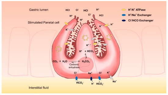 Gastric parietal cells are mainly located in the glands of the fundus mucosa. They are pyramidal cells each with a large basal surface next to the basement membrane and an apex towards the lumen of the gland. There is a complex system of intracellular canaliculi within their cytoplasm; a high number of mitochondria and intracellular vesicles containing H+/K+-ATPases are the main characteristics of these cells [14]. With these characteristics, parietal cells specialize in the energy-intensive task of counter-gradient electrolyte transport. They secrete high amounts of H+ and Cl− across their apical membranes and are able to form a gradient of more than four million-fold across the membranes of their secretory canaliculi. Even at rest, the lumen of the stomach can have a pH of less than 4 [15]. Upon stimulation, the complex tubulovesicle structure in which the H+/K+-ATPases are located tends to disappear as it fuses with the secretory canaliculi, thus considerably expanding cell surfaces [14,16]. This translocation of proton pumps from the cytosol to the secretory surface increases the amount of protons that can be secreted. However, for each proton that is secreted, an equal amount of OH− is left in the cytoplasm. This OH− is rapidly converted by carbonic anhydrases into HCO3− which is subsequently exported by basolateral ion exchangers, thereby preventing the detrimental effects of excessive intracellular alkalinization. Key players in this process are anion exchanger proteins, such as the HCO3−/Cl− exchanger AE2 and the Na+/H+ exchanger [17].