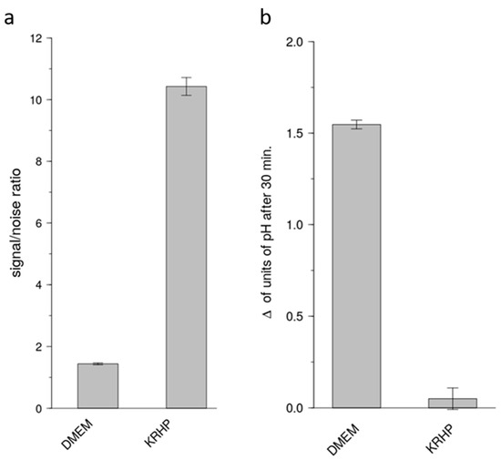 (a) Signal (SNARF-SNARF-1 AM loaded wells) to noise (blank wells) ratios of DMEM and KRHP media after 10 min of treatment. Data presented as mean ± SEM. Each group consisted of 96 wells from 5 independent experiments. (b) Difference in intracellular pH after 35 min exposure to vehicle solution. N of 5 biological replicates (BR).