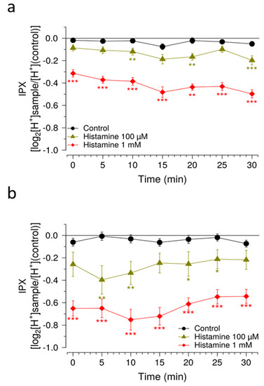 Histamine priming of HGT-1 cells. Intracellular proton index (IPX) of HGT-1 cells exposed to 100 and 1000 µM histamine (green diamonds and red squares, respectively) without (a) and with (b) 10 µM histamine pretreatment. Recordings were performed at room temperature at intervals of 5 min. Evaluated wells contained 20 µM EIPA and 20 µM DIDS for inhibiting HCO3− extrusion systems. Cells treated with vehicle solution served as negative control (circles). Data presented as mean ± SEM. Statistical significance was evaluated using one-way ANOVA with Tukey’s range test for multiple comparisons. N of 4 BR, 8–12 TR. * denotes p < 0.05, ** denotes p < 0.01 and *** denotes p < 0.001 for the corresponding histamine concentration when compared to negative control.