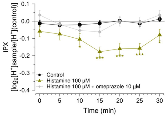 Effect of omeprazole on proton secretion by HGT-1 cells. Intracellular proton index (IPX) of HGT-1 cells exposed to 100 µM histamine alone (green triangles) or in combination with 10 µM omeprazole (grey diamonds). Recordings were performed at room temperature at intervals of 5 min. Cells treated with vehicle solution served as negative control (black circles). Data presented as mean ± SEM. Statistical significance was evaluated using one-way ANOVA with Tukey’s range test for multiple comparisons. * denotes p < 0.05 and *** denotes p < 0.001 for the corresponding compound, according to the assigned color when compared to the negative control. N of 6 BR, 12–24 TR.