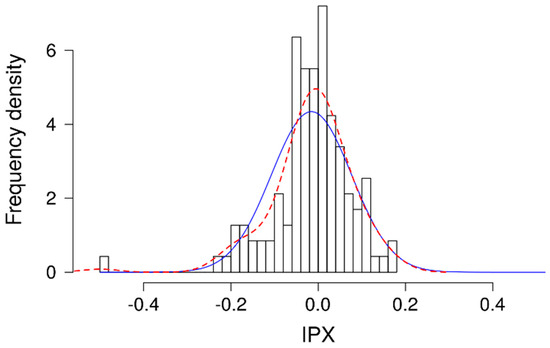 Distribution of IPX values for vehicle solution-treated cells. Density histogram for the intracellular proton index (IPX) of 118 technical replicates (control lanes). Data from 38 separate measurements. Mean of −0.015, SD of 0.092. The density curve for the data (red) is presented along a normal distribution curve with the above-mentioned parameters (blue). Based on these data, a 95% confidence interval was calculated, which ranged from −0.2 to 0.17. Plates in which more than one control lane presented an IPX average beyond the above-mentioned range were excluded from analysis. Similarly, plates in which more than 1 histamine control failed to induce an increase in proton secretion were also excluded.