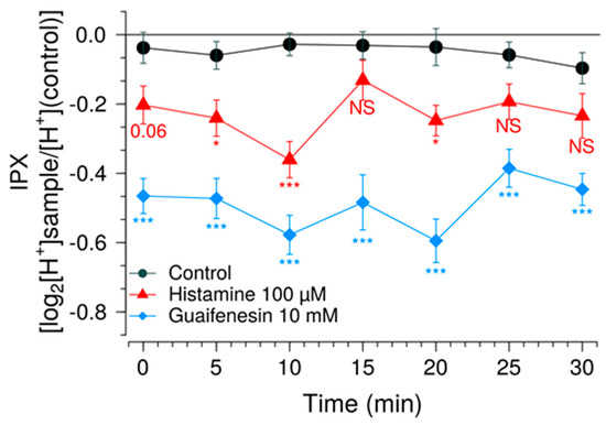 Effect of 10 mM guaifenesin on HGT-1 cells. Intracellular proton index (IPX) of HGT-1 cells exposed to 10 mM guaifenesin (blue diamonds). Recordings were performed at room temperature at intervals of 5 min. Histamine at a concentration of 100 µM (red triangles) was used as positive control. Cells treated with vehicle solution served as negative control (black circles). Data presented as mean ± SEM. Statistical significance was evaluated using one-way ANOVA with Tukey’s range test for multiple comparisons. * denotes p < 0.05 and *** denotes p < 0.001 for the corresponding compound according to the assigned color when compared to the negative control. N of 4 BR, 8–16 TR.