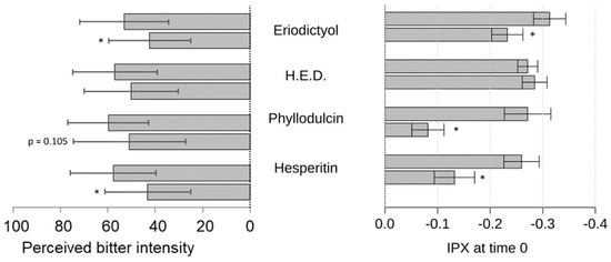 The highest concentration of guaifenesin at 13,333 ppm was chosen for the sensory trial as it is a commonly used concentration in liquid cough formulations. As a result, all concentrations of guaifenesin administered were evaluated to be significantly more bitter than water. Afterwards, the panelists were asked to rank changes in the bitterness perceived by 1333 ppm (6.7 mM) guaifenesin when co-administered with 100 ppm (330.8 µM hesperitin); 100 ppm (346.9 µM) eriodictyol; 7 ppm (24.5 µM) phyllodulcin; or 100 ppm (331 µM) homoeriodictyol. Among the tested flavonoids, eriodictyol and hesperitin were able to reduce the perceived bitterness of guaifenesin (1333 ppm) in a manner that resembled the effects of these compounds on the changes induced by guaifenesin on the IPX index of HGT1 cells at minute 0 (Figure 10). The bitter-masking effect by phyllodulcin did not reach the level of statistical significance (p = 0.105), but demonstrated a trend toward the respective result in the HGT-1 cell assay.