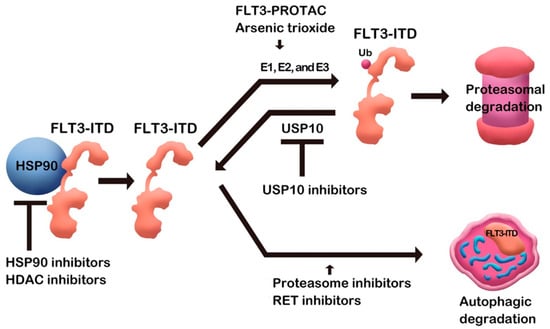 Quite a few small molecules induced FLT3 degradation (Table 1). Some small molecules binding directly to FLT3 protein may have specificity to FLT3, while compounds such as Hsp90 inhibitors can be nonspecific, affecting many Hsp90 clients. As a mechanism of degradation, some compounds induce proteasomal degradation, and autophagic degradation is also employed in FLT3 downregulation (Figure 1). Although various mechanisms are involved, as described above, target protein degradation, at least partially, contributes to the antileukemic effects in addition to kinase activity inhibition. Therefore, the research compiled above will open an avenue for FLT3 degraders as AML therapeutic agents. After completing the FLT3 degrader study in AML, it will be extended to all treatments.