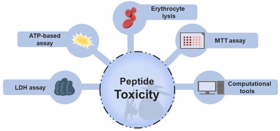 Main approaches employed to evaluate the toxicity of peptides. Traditional screening of non-toxic peptides is performed using different in vitro techniques, including MTT, LDH, erythrocyte lysis, and ATP-based assays. These methods are based on the measurement of intracellular markers released during cell death or lysis, such as hemoglobin (red blood assay), enzymes (LDH assay), or on the analysis of cell viability determined by enzymatic activity, measured, for example, by the MTT assay or by the amount of cell energy (ATP-based assay). Recently, computational models were reported to assist in peptide toxicity prediction.