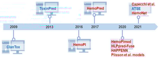 Historical overview of the development of freely available tools and models for prediction of peptide toxicity. Big biomedical peptide data have been explored to design new predictive methods that facilitate adequate access to the full potential of peptides. Despite the many years of peptide science, our literature review demonstrates that these in silico approaches are relatively new. From the pioneering and innovative ClanTox [112] and ToxinPred [40] launched in 2009 and 2013, respectively, ten high-throughput computer toxicity prediction tools were developed that mainly predict peptides’ hemolytic effects. Most of them have been released in the last 5 years. Capecchi et al. [38] and HemoNet [113] are the latest hemolytic classifiers. Some predictors such as HAPPENN [36] and HemoPI [26] have more than one version. HemoPI has 5 SVM methods, while HAPPENN is composed of 3 methods. However, due to the difference in performance reported by the authors, for this chronology, we considered only the best-in-class performance methods. The three Plisson models [37] were considered due to high similarity in performance metrics. Peptide toxicity predictors are highlighted in blue, and the classifiers for predicting peptides’ hemolytic activity are colored in red.