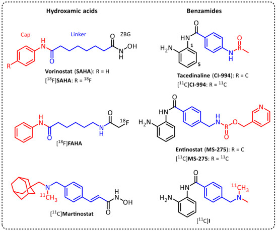 In the last two decades, numerous HDAC inhibitors and radiotracers have been developed, but only a few were able to cross the blood–brain barrier (BBB) and exhibit suitable pharmacokinetics for brain imaging. HDAC inhibitors contain generally a zinc-binding group (ZBG), a linker and a cap group, visualized in Figure 1 on the structures of published inhibitors. Over the years hydroxamic acids and benzamides have emerged as the most frequently used ZBGs.