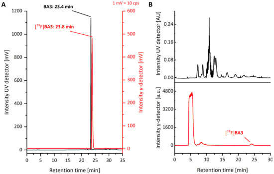 (A) Analytical radio- and UV-RP-HPLC chromatograms of formulated [18F]BA3 spiked with the corresponding reference compound BA3 (ReproSil-Pur 120 C18-AQ column (250 × 4.6 mm, 5 µm), Gradient MeCN/20 mM NH4OAcaq. (see quality control), flow rate: 1 mL/min; red: radio-RP-HPLC chromatogram, black: UV-RP-HPLC chromatogram); and (B) Radio- and UV-RP-HPLC chromatograms obtained for the isolation of [18F]BA3 by semipreparative RP-HPLC (ReproSil-Pur 120 C18-AQ (250 × 10 mm, 10 µm), 40% MeCN/20 mM NH4OAcaq., flow rate: 4 mL/min; AU = absorption unit, a.u. = arbitrary unit; red: radio-RP-HPLC chromatogram, black: UV-RP-HPLC chromatogram).