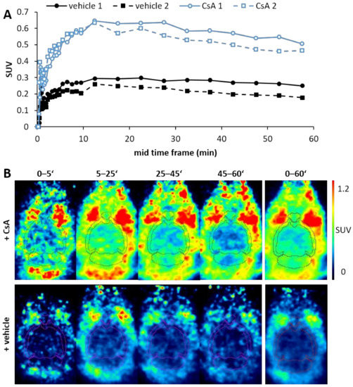 (A) Time–activity curves (TACs) of CD-1 mice brain region after pre-administration of vehicle (n = 2; black line) or cyclosporine A (CsA; P-gp inhibitor, 50 mg/kg, n = 2; blue line) 30 min pre-injection of [18F]BA3. (B) Horizontal representative PET image of the brain after pre-administration of vehicle or CsA.